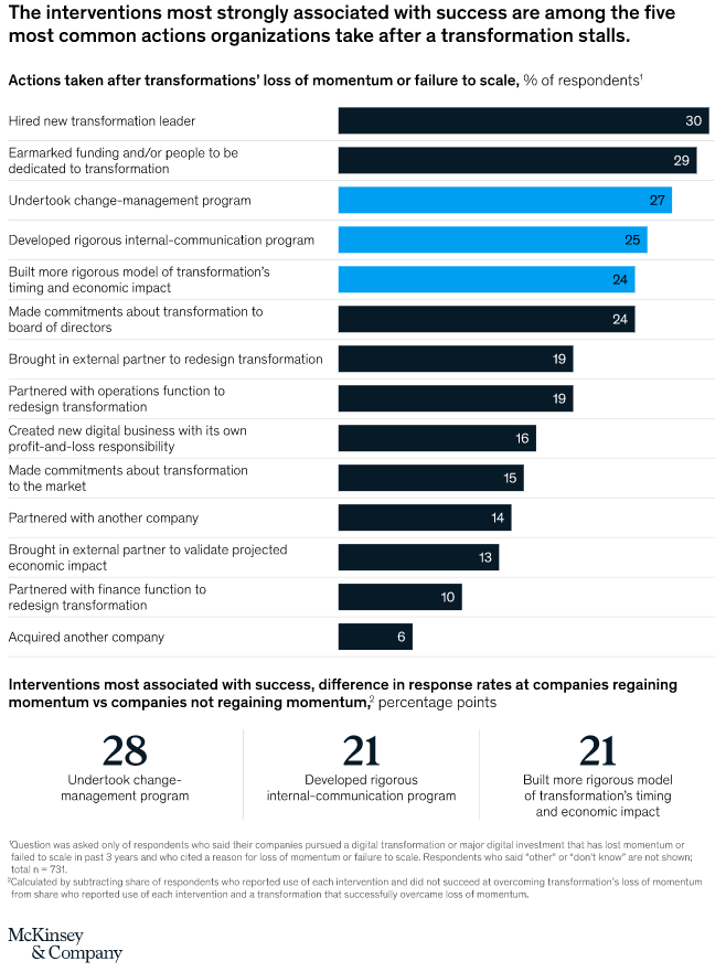 If a digital transformation stalls, organizations can regain momentum by implementing rigorous change-management and internal-communications programs and clarifying the transformation’s projected impact, which can help build alignment and commitment.