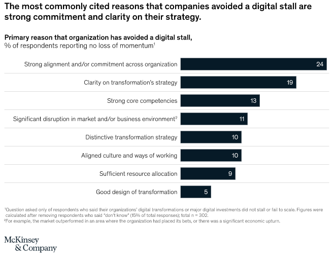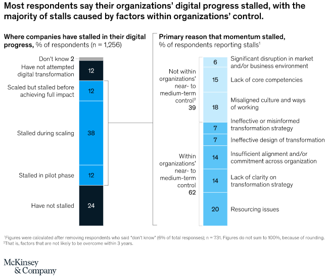 More than 60 percent of respondents who report stalled digital transformations attribute the problem to factors that—with the right discipline and focus—organizations can control. The most commonly reported sources of derailed progress include resourcing issues, lack of clarity or alignment on a company’s digital strategy, and poor quality of the digital strategy to begin with.