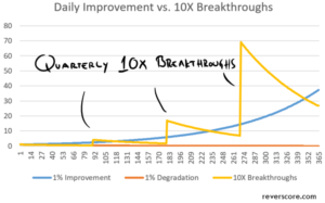 Moreover, Dunn has found that a breakthrough improvement sounds promising, but pales compared to the results of compounded daily gains.